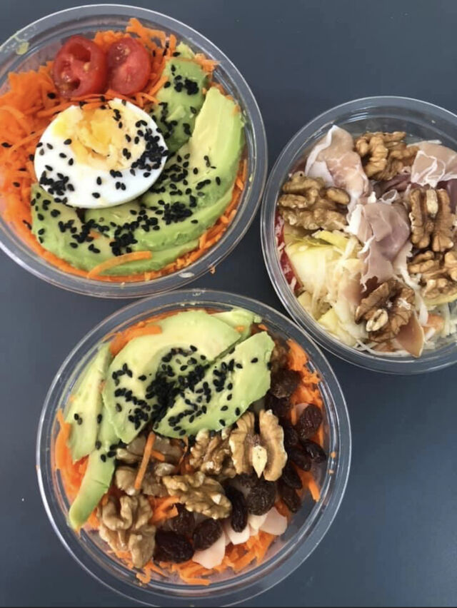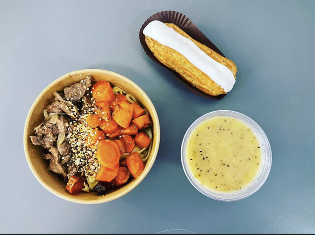 Smoothie Green coco ; Salade César bowl ; Tiramisu caramel beurre salé